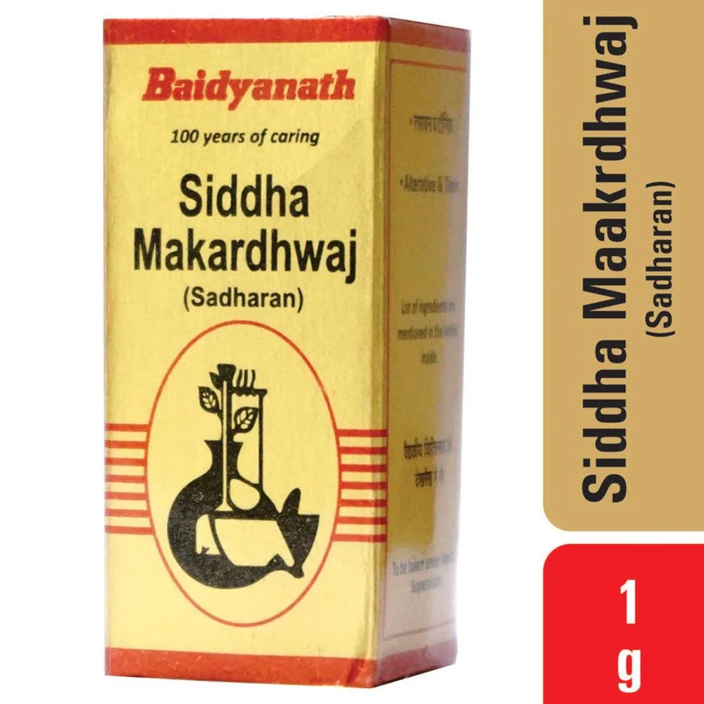 Baidyanath Siddha Makardhwaj (Sadharan) is a traditional Ayurvedic formulation used as an alterative tonic and rejuvenator to help combat general weakness, enhance vitality, and boost immunity. It is considered a fundamental formulation of Siddha Makardhwaj, without the addition of more expensive ingredients like gold and pearl ashes which are found in the "Special" variants.