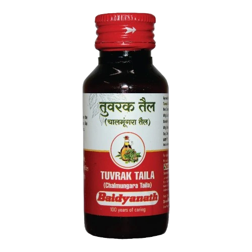 Baidyanath Tuvrak Chalmungara Talia is used for maintaining healthy skin and supporting the management of skin-related concerns. It is formulated with Tuvrak (Chalmogra) Oil, known for its potent antimicrobial and anti-inflammatory properties. This oil has been traditionally used in Ayurveda to help manage mild symptoms of conditions like leprosy, necrotic skin disorders and persistent skin irritations. It may help in soothing rashes, boils, and inflammatory skin conditions. The presence of unsaturated fatty acids helps nourish and rejuvenate the skin while supporting the healing process. Regular application may promote clearer and healthier skin.