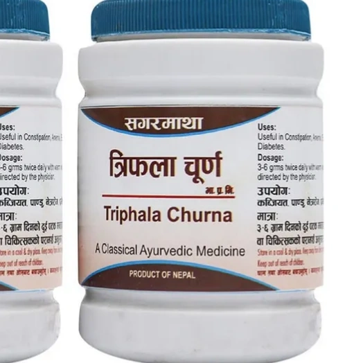 Sagarmatha Triphala Churna is a traditional Ayurvedic powder made from the equal parts of three dried fruits: Amla, Bibhitaki, and Haritaki. It is known for balancing the Tridoshas (Vata, Pitta, and Kapha), supporting digestion and regular bowel movements, aiding skin health and detoxification, and possessing antioxidant and anti-diabetic properties.